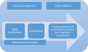 The project management (WP 1) and public relations (WP 2) are superordinate and responsible for the coordination between project and network partners as well as communication with external persons and institutions. On the content level, the early identification (WP 3) and intervention (WP 4) are in the foreground. Technological innovation (WP 5) will support them. A new business model will be developed and implemented by WP 6 based on all results and experiences of the WIPP project. Finally, an advisory board will be implemented during the WIPP project and will after the project period sustain as „The WIPP – A lighthouse of competence“ consisting of all partners of the Quadruple-Helix model . The implementation of „ The WIPP – A lighthouse of competence“will guarantee the sustainability of these established effective structures of primary health care after the end of the WIPP project.